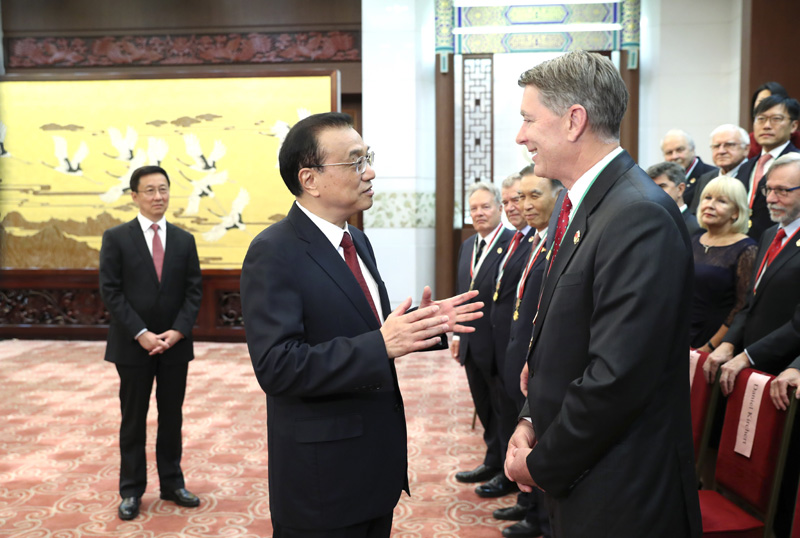 国务院总理李克强30日下午在人民大会堂亲切会见荣获2018年度中国政府友谊奖的外国专家和他们的亲属。