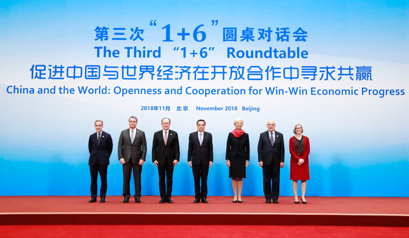 国务院总理李克强11月6日下午在钓鱼台国宾馆同世界银行行长金墉、国际货币基金组织总裁拉加德、世界贸易组织总干事阿泽维多、经济合作与发展组织秘书长古里亚、金融稳定理事会主席卡尼和国际劳工组织副总干事格林菲尔德举行第三次“1+6”圆桌对话会。会议围绕“促进中国与世界经济在开放合作中寻求共赢”的主题,就当前世界经济走势、维护多边贸易体制等议题深入交流。