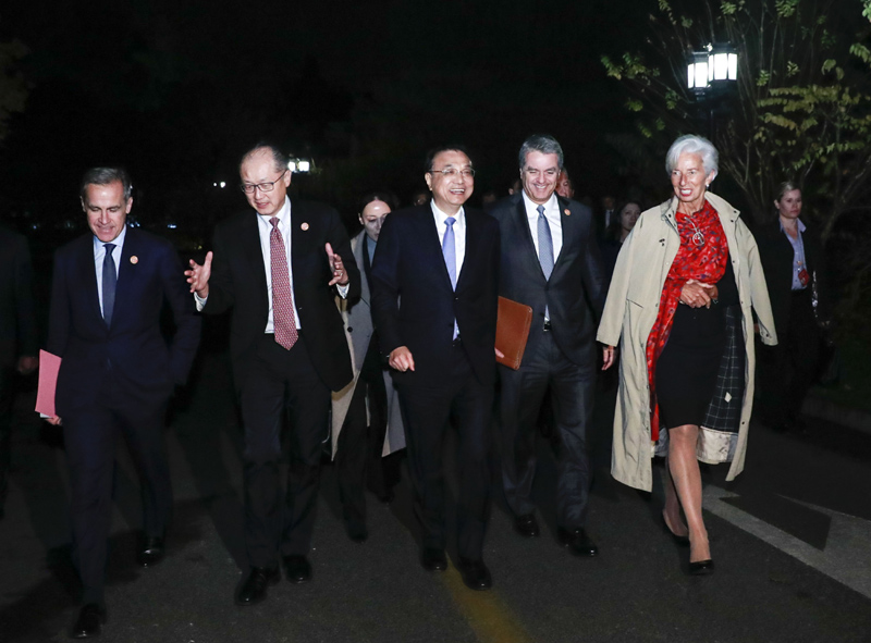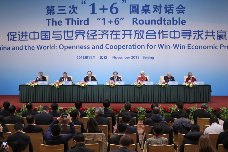 国务院总理李克强11月6日晚在钓鱼台国宾馆同世界银行行长金墉、国际货币基金组织总裁拉加德、世界贸易组织总干事阿泽维多、经济合作与发展组织秘书长古里亚、金融稳定理事会主席卡尼和国际劳工组织副总干事格林菲尔德举行第三次“1+6”圆桌对话会后共同会见记者。