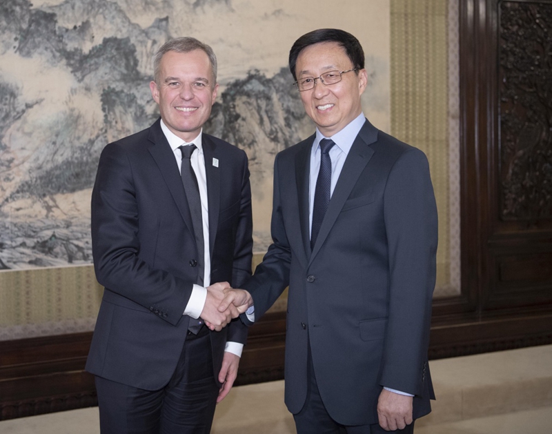 韩正表示,中法全面战略伙伴关系持续高水平健康稳定发展,各领域务实合作取得丰硕成果。习近平主席与马克龙总统就双边关系、重大国际问题进行深入交流,达成广泛共识。中方愿同法方共同努力,落实两国元首共识,推动中法关系迈上新台阶。中方高度重视生态环境领域国际合作,希望与法方加强在生态环境保护、应对气候变化、生物多样性保护等方面的对话与交流,携手建设清洁美丽的世界。