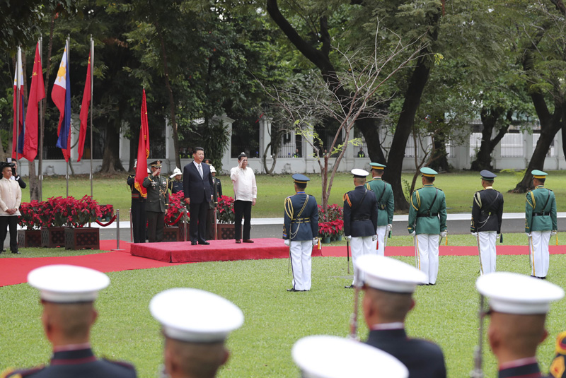 菲律宾总统府充满庄严、隆重、热烈的气氛。当地时间下午4时40分许,习近平乘车抵达总统府,受到杜特尔特热情迎接。两国元首登上检阅台。仪仗队行持枪礼。鼓手敲起激昂的鼓点,号手吹响迎宾的号声。军乐队奏中菲两国国歌。现场鸣放21响礼炮。习近平在杜特尔特陪同下沿红地毯检阅仪仗队。检阅毕,习近平同菲方主要官员握手,杜特尔特同中方陪同人员握手。两国元首共同前往总统府主楼。沿途,当地艺术家伴着菲律宾传统竹管弦乐翩翩起舞,悠扬的乐声、曼妙的舞姿吸引两国元首不时驻足欣赏。
