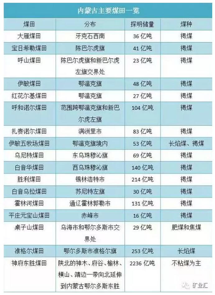 其中,霍林河煤矿是中国建成最早的现代化露天煤矿;准格尔煤田是中国最大的露天开采煤田;东胜煤田与陕西神府煤田合称东胜—神府煤田,是世界七大煤田之最。