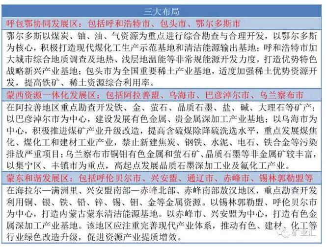 根据自治区成矿地质条件、矿产资源赋存特点和环境承载能力,将自治区按呼包鄂协同发展、蒙西资源一体化发展、蒙东和谐发展3个地区各有重点、协调发展的方向进行布局。