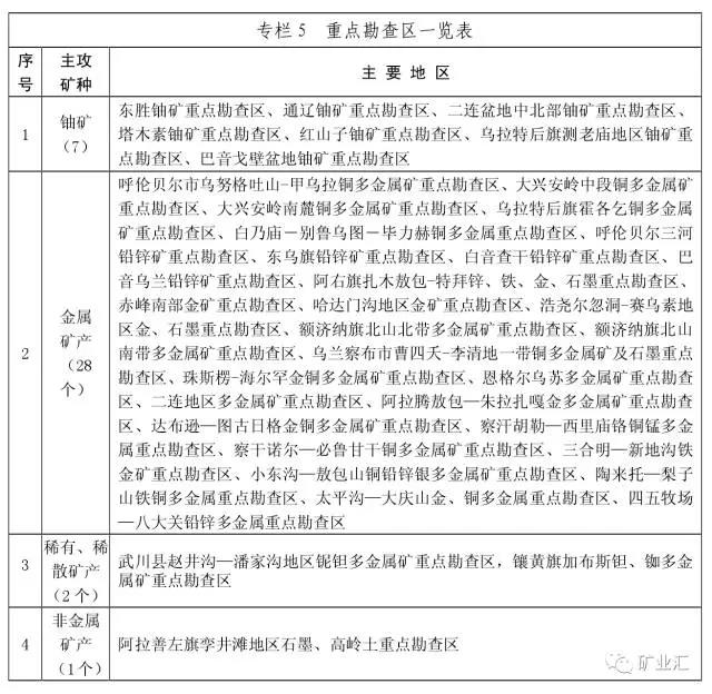 以铀、铁、铜、铅、锌、金、银、稀土、稀有和分散元素矿产、晶质石墨等为勘查主矿种,划定了38处重点勘查区,其中包括东胜、通辽、等15处国家级重点勘查区。