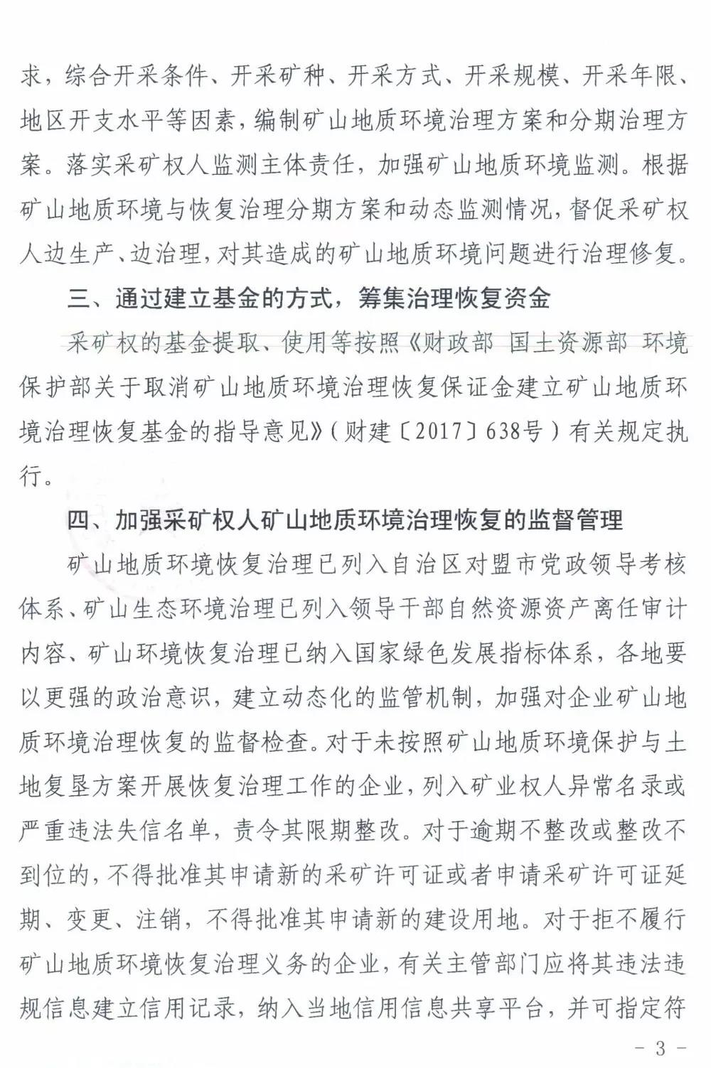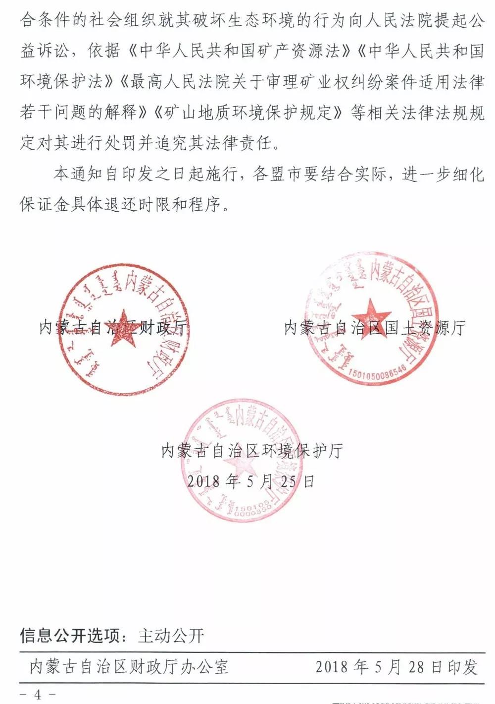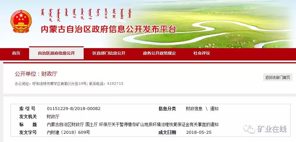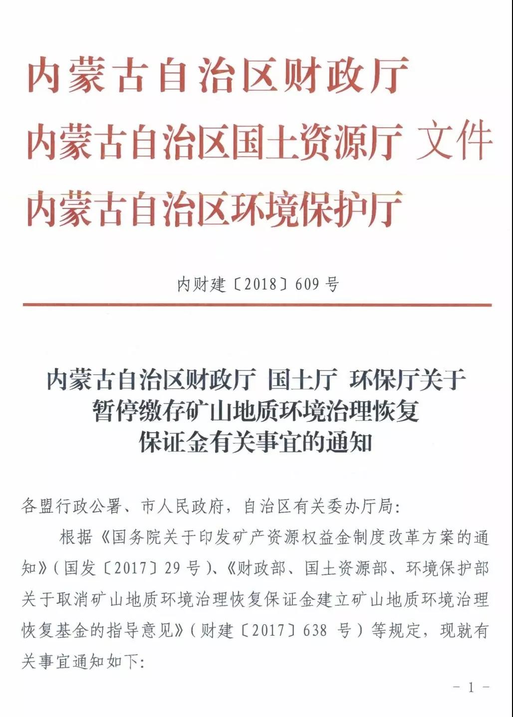 内蒙古自治区财政厅、内蒙古自治区国土资源厅、内蒙古自治区环境保护厅联合发布《关于暂停缴存矿山地质环境治理恢复保证金有关事宜的通知》(内财建〔2018〕609号),要求暂停缴存矿山地质环境治理恢复保证金,以后通过建立基金的方式,筹集治理恢复资金。