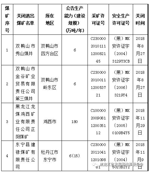黑龙江省2018年度完成化解煤炭过剩产能煤矿名单(第一批)公告