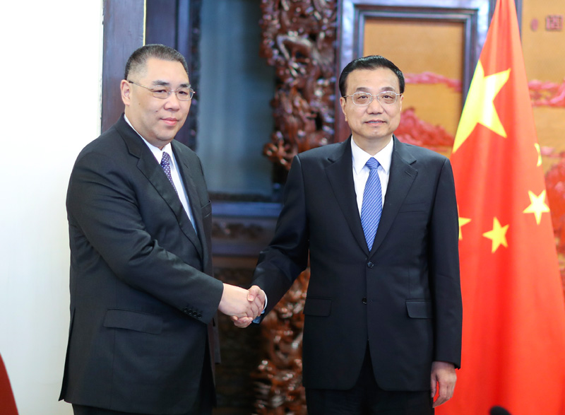 李克强指出,中央政府坚定不移贯彻“一国两制”、“澳人治澳”、高度自治的方针,严格依照宪法和基本法办事,全力支持澳门特别行政区政府和行政长官依法施政。发展经济是政府的首要任务,目的是为了改善民生。希望澳门特别行政区政府和社会各界人士齐心协力,持续推进经济结构调整,促进澳门经济适度多元发展。优化营商环境,防范经济金融风险,厚植澳门经济持续发展的基础。充分发挥与葡语国家联系广泛等优势,积极参与粤港澳大湾区建设和“一带一路”建设,在融入国家发展大局的过程中更好成就自身。扎实推进民生改善,切实回应市民关切,让广大市民有更多获得感和幸福感。
