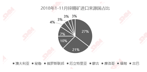 其中澳大利亚进口累计共73.83万实物吨,占1-11月锌精矿进口总量的27%,位居第一位,秘鲁进口累计为56.31万实物吨,占1-11月锌精矿进口总量的21%,位居第二位,俄罗斯进口累计共26.19万实物吨,占1-11月锌精矿进口总量的10%,位居第三位。