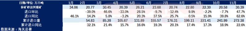 行业资讯根据最新海关数据显示,11月进口锌精矿为30.39万吨(实物吨),同比增加了11.7万吨(实物吨)。2018年1-11月累计进口量272.35万吨(实物吨),累计同比增加了23%。