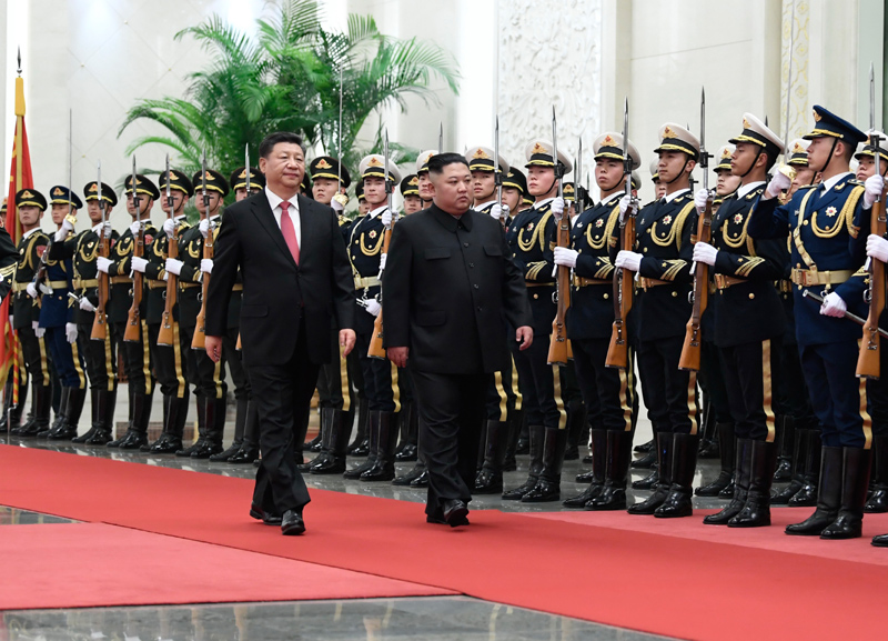 1月8日,中共中央总书记、国家主席习近平同当日抵京的朝鲜劳动党委员长、国务委员会委员长金正恩举行会谈。会谈前,习近平在人民大会堂北大厅为金正恩举行欢迎仪式。新华社记者 黄敬文 摄