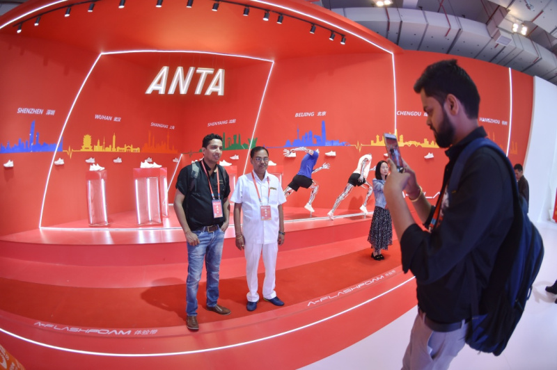 在一年一度的中国(晋江)国际鞋业暨国际体育产业博览会上,来自印度的客商在安踏展位前留影(2018年4月19日摄)。新华社记者 宋为伟 摄