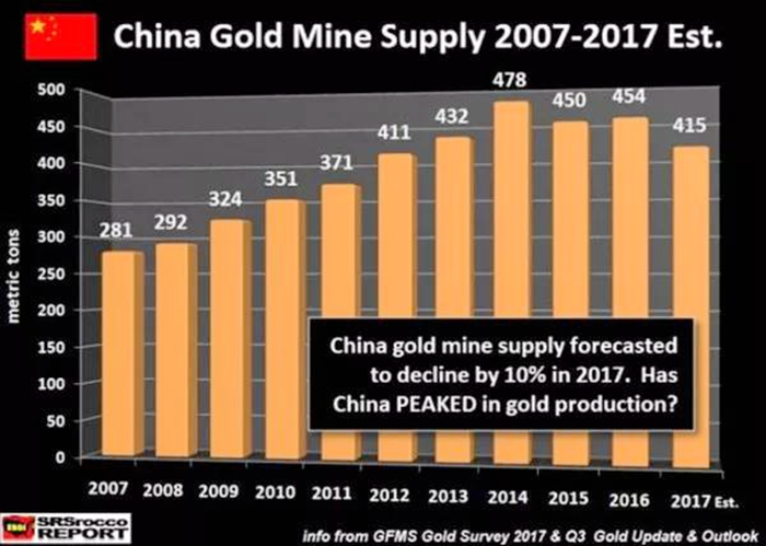 《中国黄金年鉴2018》全面反应了2018年我国黄金产业的发展现状、成绩及问题。截至2017年底,全国黄金查明资源储量13195.60吨,同比增长8.45%,我国黄金查明资源储量已实现连续十三年增长,并连续三年突破万吨大关。2017年我国黄金产量为426.14吨(不含进口原料产金),与去年同期相比减少27.34吨,同比下降6.03%,是1974年以来首次出现的年降幅超过5%的下降,但我国黄金产量仍继续稳居全球首位,自2007年以来已连续11年位居全球第一。黄金产量下滑的主要原因是:国内黄金企业矿石品位下降,低位的黄金价格使得黄金矿山企业的盈利空间进一步减小;相关省区先后出台了自然保护区内矿业权清理工作方案,矿山企业面临的环保压力空前,部分黄金矿山企业减产或关停整改,山东、江西、福建等重点产金省的黄金产量都出现了不同程度的下降。
