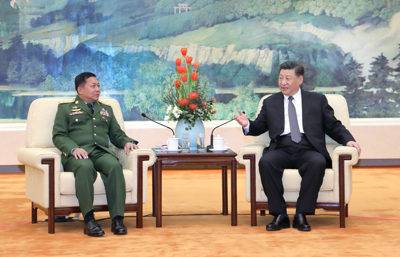 4月10日,国家主席习近平在北京人民大会堂会见来华访问的缅甸国防军总司令敏昂莱。新华社记者 李刚 摄