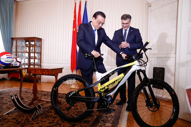 中国篮球运动员姚明是全球知名的篮球明星,克罗地亚“红白格子军团”则是去年俄罗斯世界杯的亚军获得者。当地时间4月10日上午,李克强总理将一件姚明签名的13号球衣,赠送给篮球爱好者、克罗地亚总理普连科维奇。普连科维奇总理则回赠李克强一个克罗地亚国家足球队集体签名的足球。除此之外,李克强所赠的礼品还有一个印着中克两国国名和国旗的特制篮球。普连科维奇还赠送中国总理一辆克罗地亚企业生产的运动自行车。两国总理当天会谈后,共同见证了双方在体育等领域双边合作文件的签署。中克政府发布的联合声明表示,双方愿加强体育领域合作,支持两国政府体育部门、奥委会和体育单项协会加强交流。