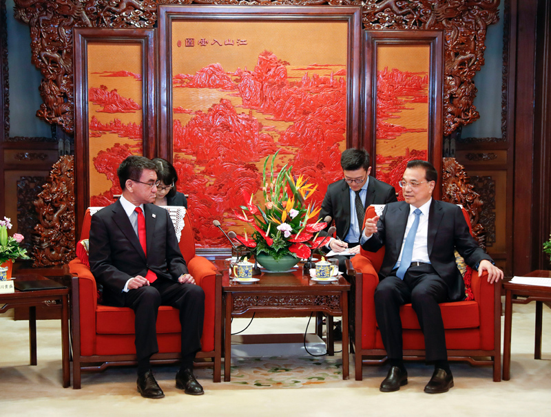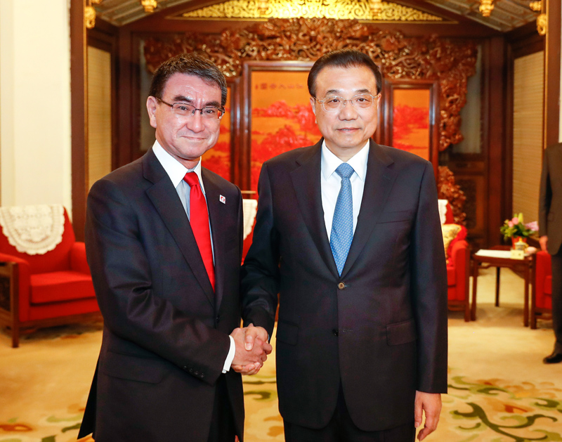 国务院总理李克强15日在中南海紫光阁会见出席第五次中日经济高层对话的日本外相河野太郎以及部分日本政府内阁成员。
