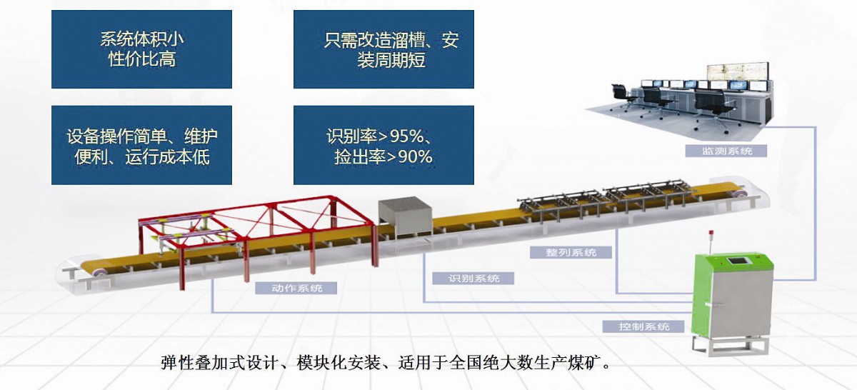 煤矸石是煤炭开采和洗选加工过程中排出的固体废弃物,其产量占原煤产量的15%左右。加强对煤矸石综合治理、综合利用的研究及提高洁净煤技术,是当前燃煤大国的重要研究内容,也是环境保护与发展的需要。利用智能技术对煤矸石进行分选也是智能化矿山重要的研究课题。煤矸石智能分选机器人系统能够大幅提高生产效率。如果一年生产按300天计算,每天工作时长为20小时,大小在200~400mm的不规则煤和矸石平均重量约15kg,煤矸石智能分选机器人标准拨手每小时动作3000次,每小时拨离能力为45吨,每天拨离能力900吨,年拨离能力约27万吨;大小在50~180mm的不规则煤和矸石平均重量约4kg,煤矸石智能分选机器人标准抓手每小时动作2500次,每小时最大拨离能力为10吨,每天拨离能力200吨,年拨离能力约6万吨。2个拨手加1个抓手每年能完成60万吨分选量。