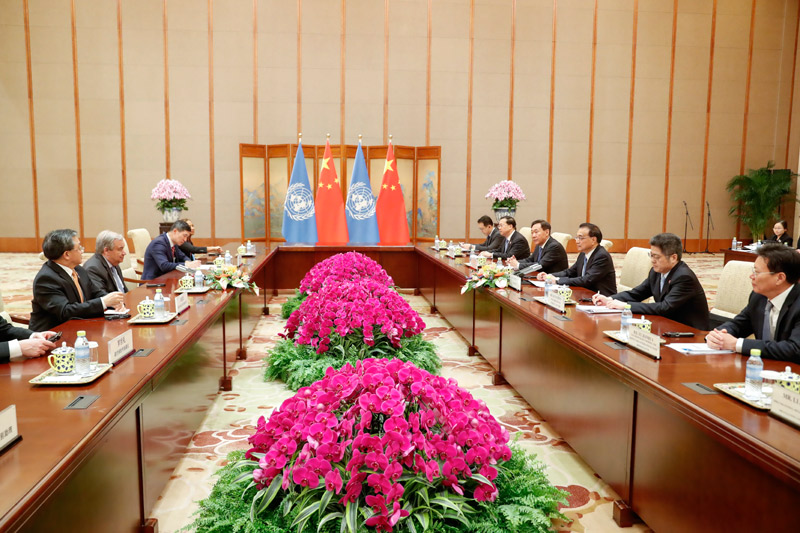 李克强表示,当前国际形势纷繁复杂,更加需要联合国在国际事务中发挥核心作用。中国作为联合国安理会常任理事国和最大发展中国家,坚定维护多边主义,维护以联合国为核心的国际体系,维护以世界贸易组织为核心的多边贸易体制。世界要和平、要发展,就应当遵循联合国宪章的原则和精神。只有这样,才能持久地维护人类和平,推动经济增长,也有利于为各国开展双边合作创造良好的国际环境。中国支持联合国在国际事务中发挥重要作用,愿同联合国及其机构保持密切合作,推进2030年可持续发展议程,加强南南合作,深化南北合作,共同应对气候变化等复杂问题,维护世界的和平、稳定与繁荣。