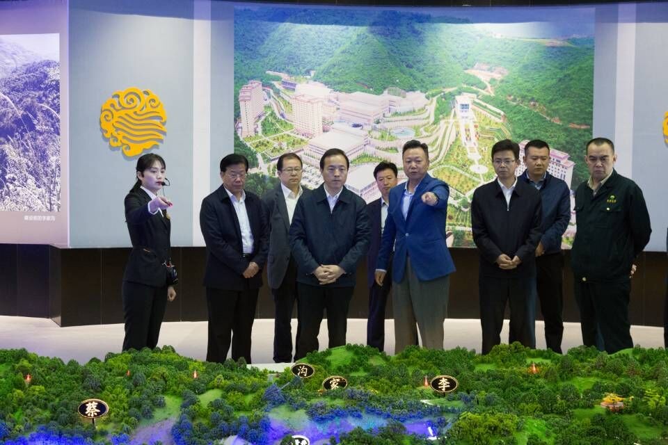 甘肃省副省长周学文(前左一)听取亚特集团党委书记、金徽矿业董事张世新(前左二)介绍矿山绿色发展情况