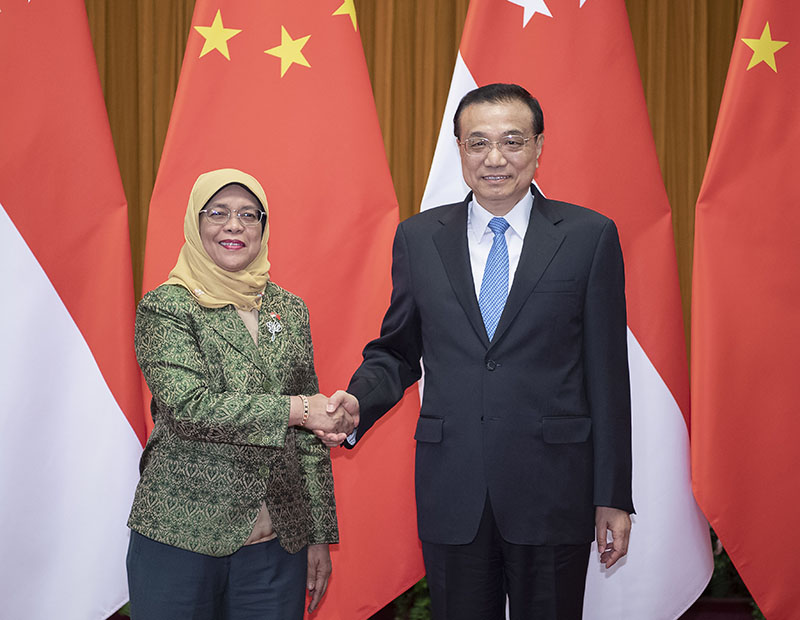 李克强表示,中国和新加坡隔海相望,两国在相互尊重、平等合作、互利共赢基础上发展了良好关系,给两国人民带来福祉。新加坡是个多元文明构成的社会。昨天,习近平主席同总统女士举行了富有成果的会见,展望了两国关系广阔前景。中方愿同新方发挥各自优势,保持良好合作势头,继续挖掘合作潜力,将“一带一路”倡议同新方发展战略相衔接,推动中国西部地区和新加坡对接,扎实推进“陆海新通道”、第三方市场、智慧城市、技能培训等领域合作。希望双方推进文明和文化的交流,密切人员往来,夯实两国友好的民意基础,促进双边关系继续向前发展。中方愿同新方共同应对全球性挑战,为世界和地区的和平稳定发展作出贡献。