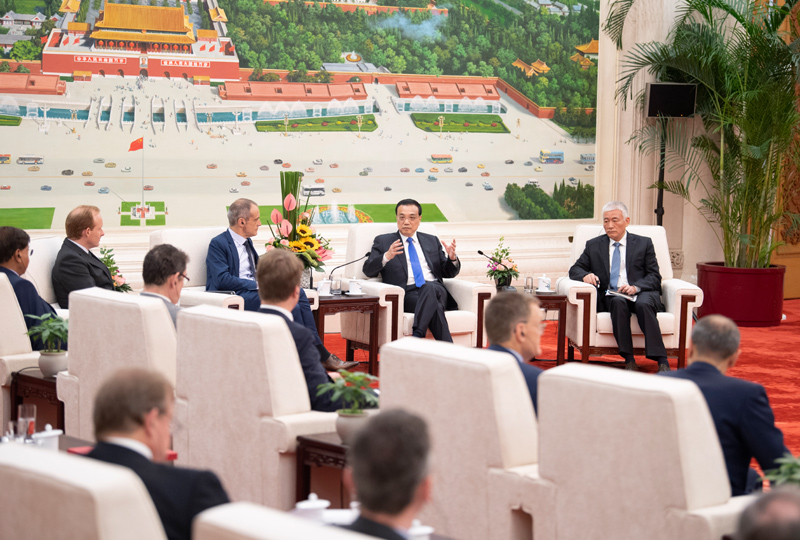 国务院总理李克强6月20日上午在人民大会堂会见来华出席“全球首席执行官委员会”第七届圆桌峰会的知名跨国公司负责人,并同他们座谈。