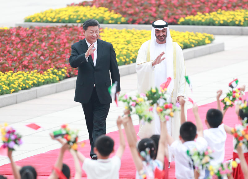 7月22日,国家主席习近平在北京人民大会堂同阿联酋阿布扎比王储穆罕默德举行会谈。这是会谈前,习近平在人民大会堂东门外广场为穆罕默德举行欢迎仪式。新华社记者 翟健岚 摄