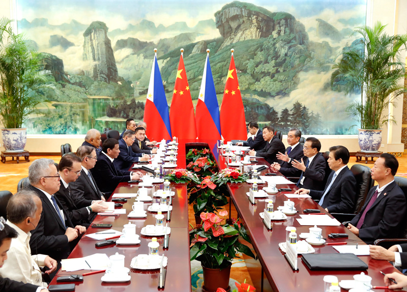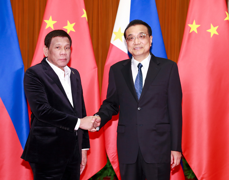 李克强表示,菲律宾是中国的友好近邻和在东南亚的重要合作伙伴,两国传统友谊源远流长。过去三年,两国关系在转圜、巩固的基础上沿着健康轨道前行。昨天,习近平主席同总统先生举行会见,规划两国关系未来发展。中菲之间的共同利益远大于分歧。我们愿同菲方在相互尊重、平等互利基础之上,将“一带一路”倡议同菲方“大建特建”规划更好对接,推动两国关系与合作持续平稳健康发展,更好造福两国和两国人民。