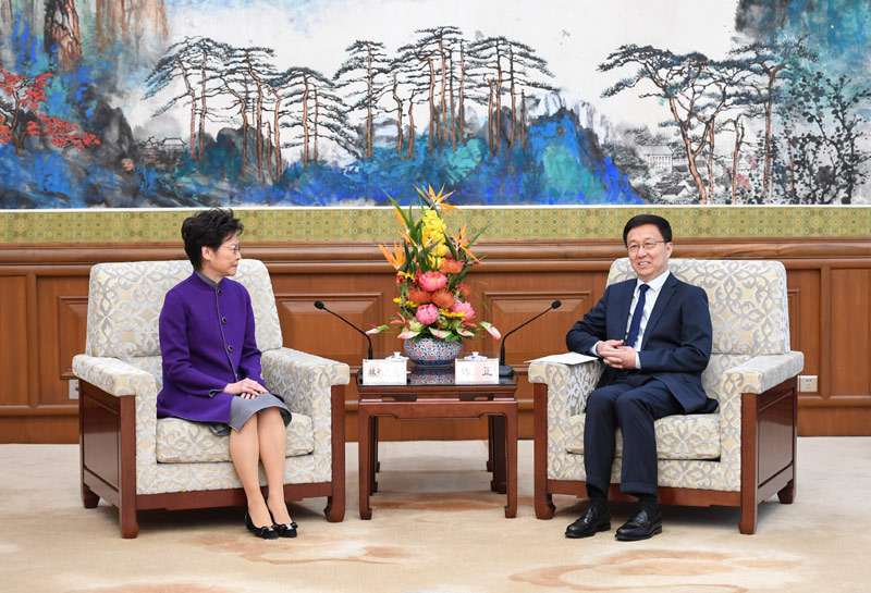 11月6日,中共中央政治局常委、国务院副总理韩正在北京钓鱼台国宾馆会见来京出席粤港澳大湾区建设领导小组会议的香港特别行政区行政长官林郑月娥。新华社记者 张领 摄