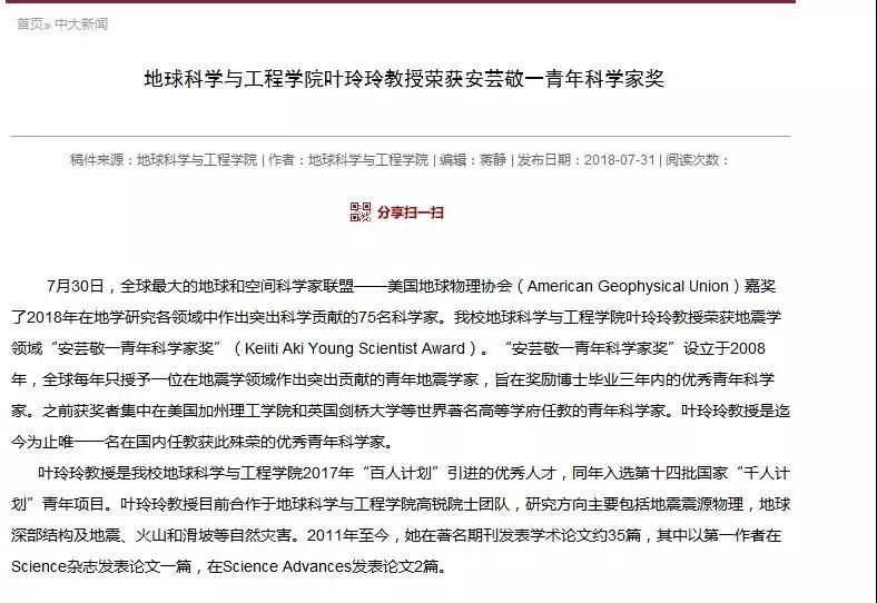 中山大学官网消息:7月30日,全球最大的地球和空间科学家联盟——美国地球物理协会(American Geophysical Union)公布了75名科学家荣获2018年“安芸敬一青年科学家奖”(Keiiti Aki Young Scientist Award),嘉奖2018年地学研究各领域中,做出突出贡献的科学家。中山大学地球科学与工程学院叶玲玲教授荣誉入选。