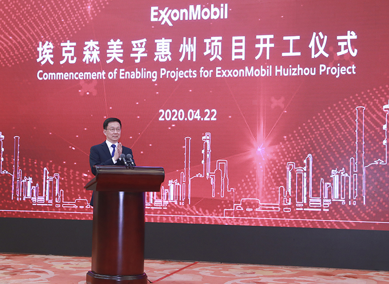 4月22日,埃克森美孚在粤港澳大湾区投资建设的广东惠州乙烯项目举行“云开工”仪式。中共中央政治局常委、国务院副总理韩正出席并宣布项目开工。新华社记者 丁林 摄