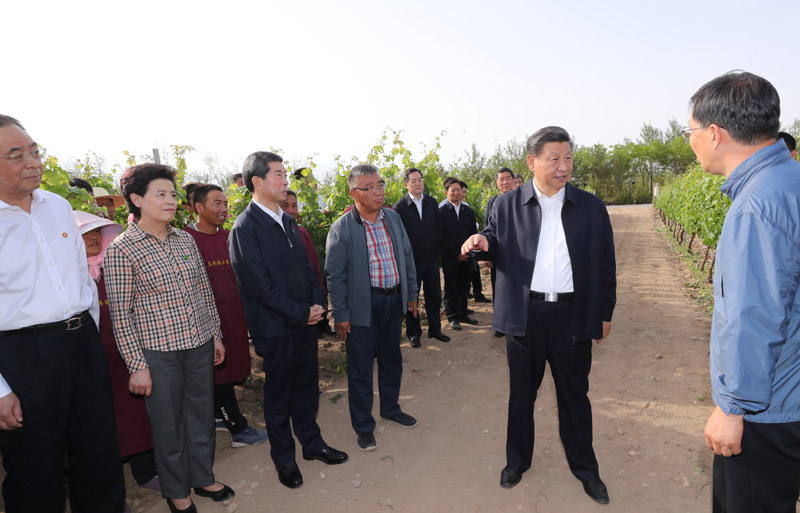 在葡萄种植园,习近平同正在作业的工人和技术人员交流,了解葡萄种植技术、产品销路和收入情况。贺兰山东麓日照充足、灌溉便利,适合种植酿酒葡萄。习近平强调,随着人民生活水平不断提高,葡萄酒产业大有前景。宁夏要把发展葡萄酒产业同加强黄河滩区治理、加强生态恢复结合起来,提高技术水平,增加文化内涵,加强宣传推介,打造自己的知名品牌,提高附加值和综合效益。