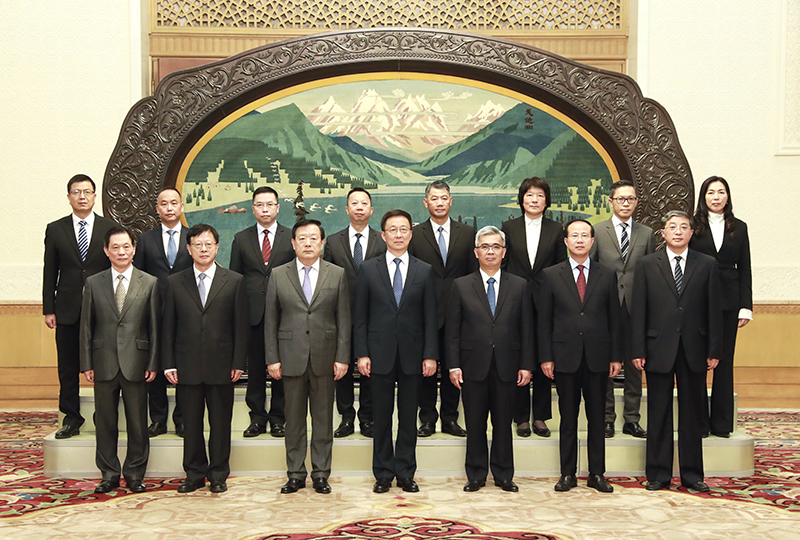 9月16日,中共中央政治局常委、国务院副总理、中央港澳工作领导小组组长韩正在北京人民大会堂会见澳门特别行政区保安司司长黄少泽率领的澳门纪律部队高层代表团,与他们交流并合影留念。新华社记者 庞兴雷 摄