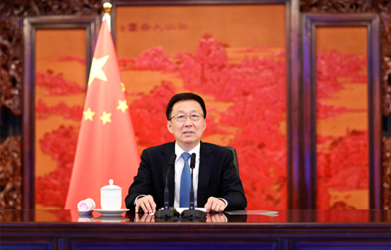 5月11日,中共中央政治局常委、国务院副总理、中土合作委员会中方主席韩正在北京通过视频方式会晤来华访问的土库曼斯坦副总理、中土合作委员会土方主席谢·别尔德穆哈梅多夫和副总理兼外长梅列多夫。新华社记者 丁林 摄