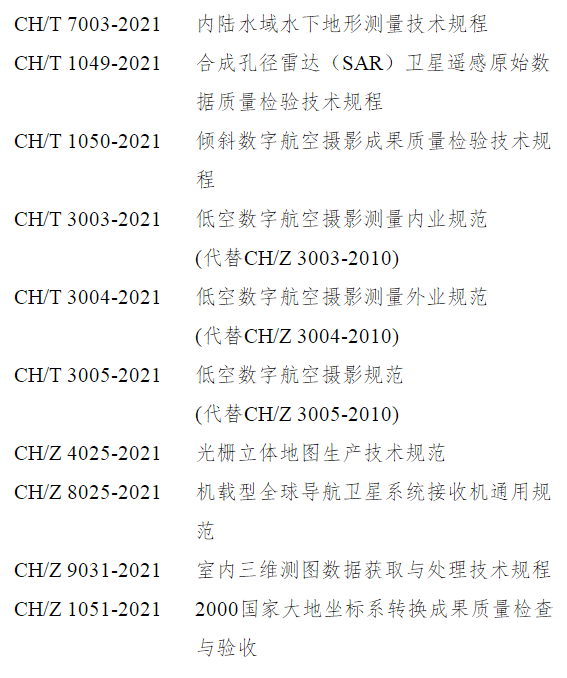 《内陆水域水下地形测量技术规程》等6项推荐性行业标准和4项技术性指导文件已通过全国地理信息标准化技术委员会审查,现予批准、发布,自2021年8月1日起实施。标准编号及名称如下: