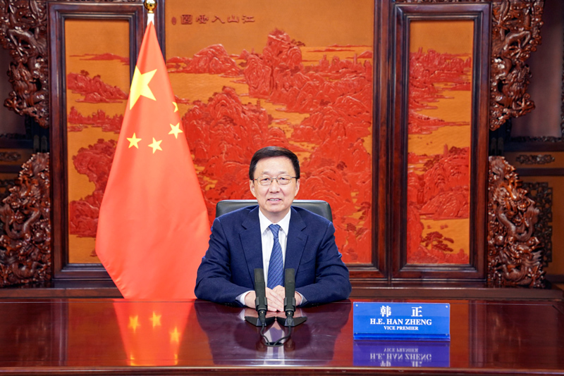 10月18日,中共中央政治局常委、国务院副总理韩正在北京以视频方式出席第二届“一带一路”能源部长会议并发表致辞。新华社记者 殷博古 摄