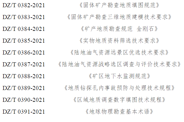 《固体矿产勘查地质填图规范》等10项推荐性行业标准已通过全国自然资源与国土空间规划标准化技术委员会审查,现予批准、发布,自2022年3月1日起实施。标准编号及名称如下: