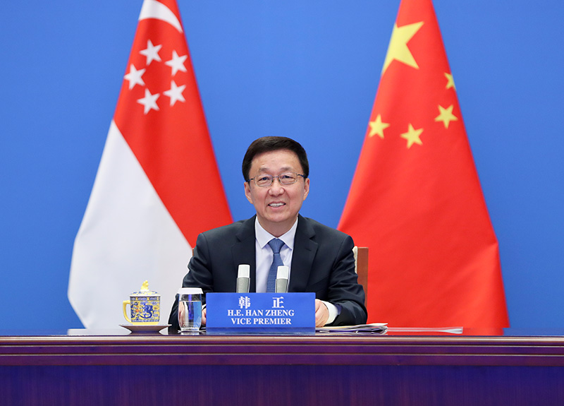 12月29日,中共中央政治局常委、国务院副总理韩正在北京同新加坡副总理王瑞杰举行视频会见,并共同主持中新双边合作联委会第十七次会议、苏州工业园区联合协调理事会第二十二次会议、天津生态城联合协调理事会第十三次会议、中新(重庆)战略性互联互通示范项目联合协调理事会第五次会议。新华社记者 丁海涛 摄
