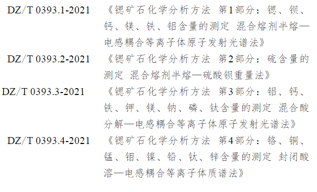 《锶矿石化学分析方法 第1部分:锶、钡、钙、镁、铁、铝含量的测定 混合熔剂半熔-电感耦合等离子体原子发射光谱法》等4项推荐性行业标准已通过全国自然资源与国土空间规划标准化技术委员会审查,现予批准、发布,自2022年5月1日起实施。标准编号及名称如下: