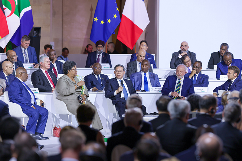当地时间6月23日上午,国务院总理李强在巴黎出席新全球融资契约峰会闭幕式并发表讲话。新华社记者 刘彬 摄