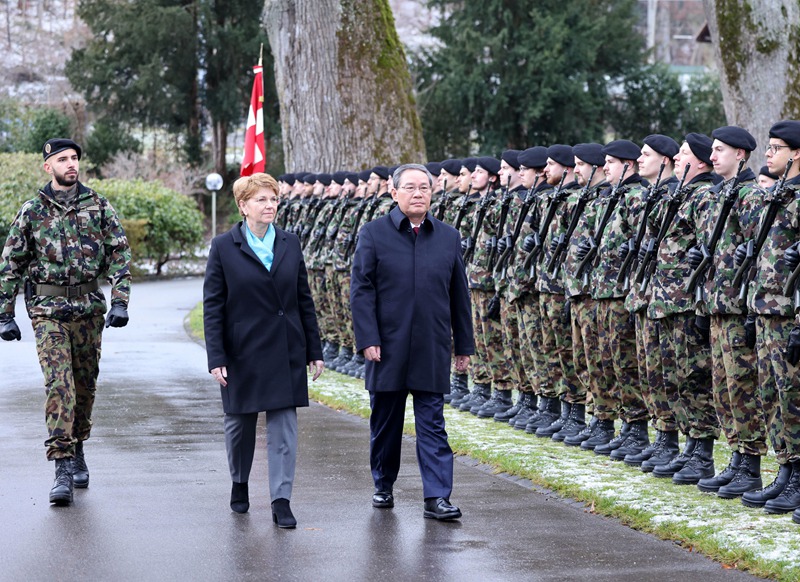 当地时间1月15日上午,国务院总理李强在伯尔尼同瑞士联邦主席阿姆赫德举行会谈。会谈前,阿姆赫德在洛恩国宾馆为李强举行隆重欢迎仪式。李强在阿姆赫德陪同下检阅仪仗队。新华社记者 王晔 摄