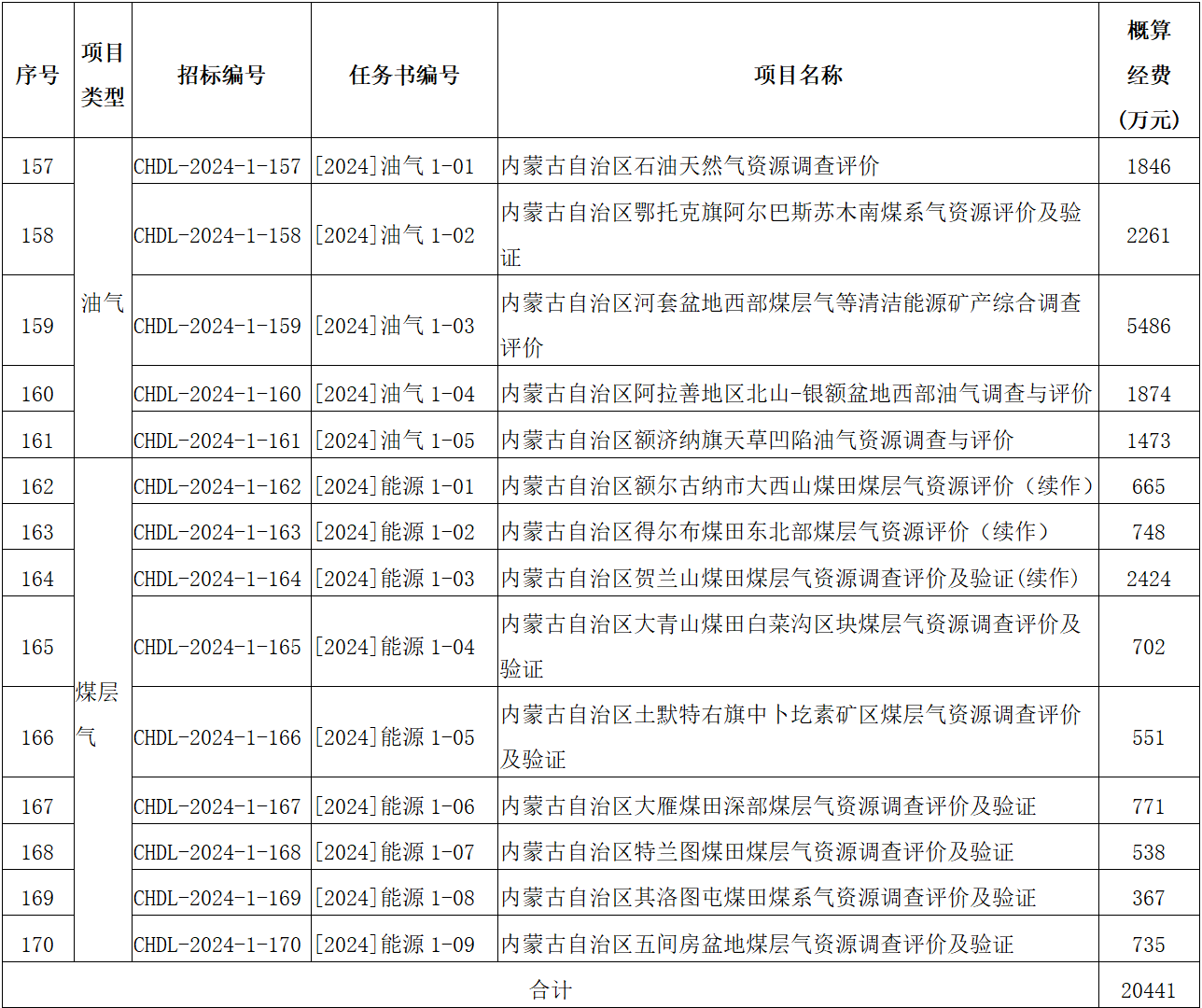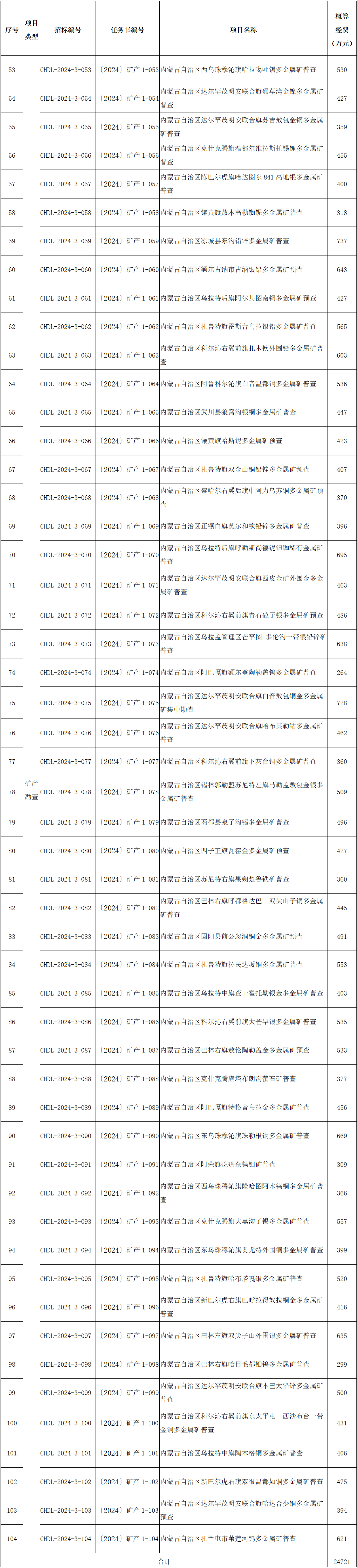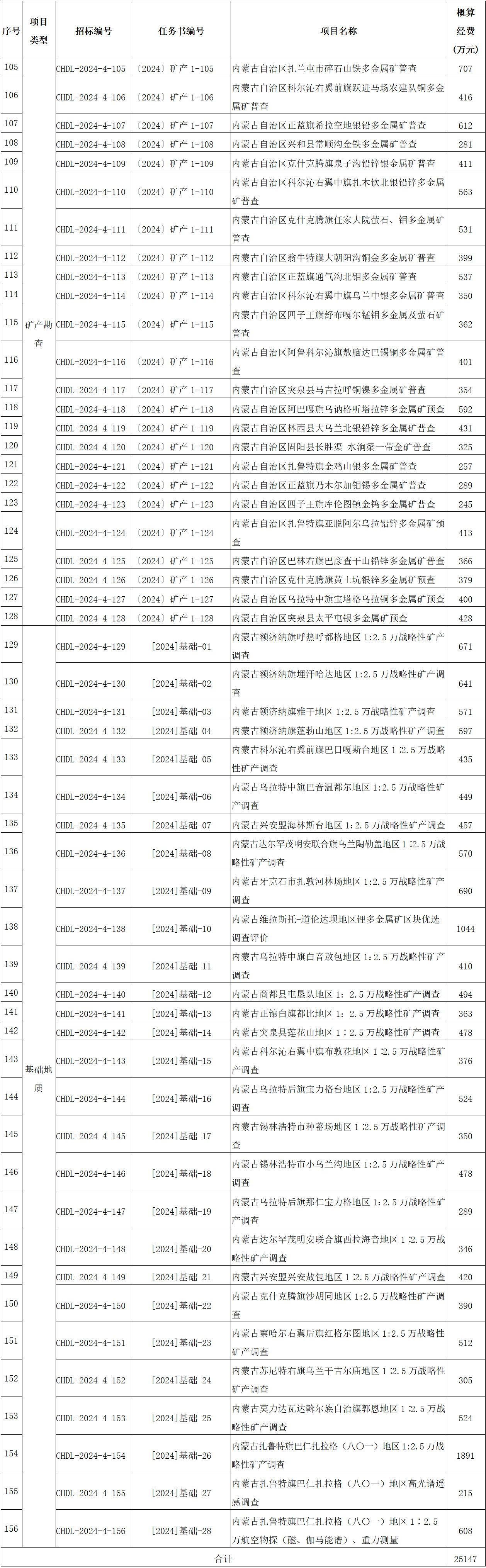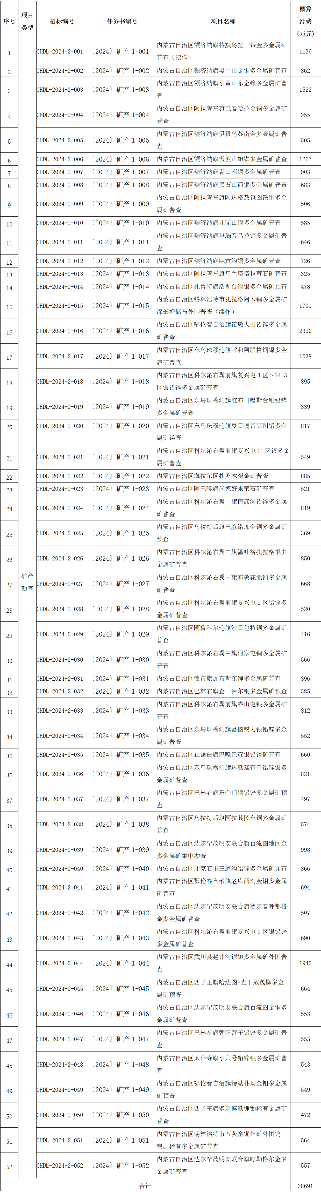 2024年度内蒙古自治区财政出资地质勘查项目招标一览表