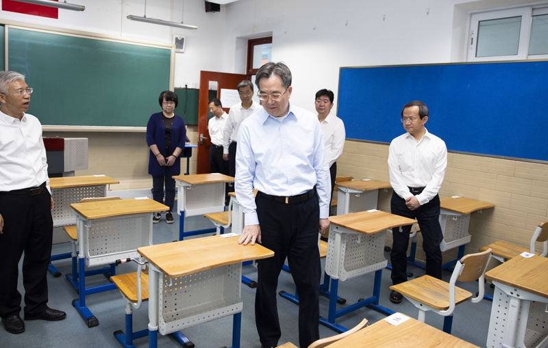 丁薛祥首先来到北京市第十三中学考点,实地察看考生存包区、待考区,了解考场设置、候考管理、服务保障情况,仔细观看智能安检门功能演示,走进监控室、广播室、考场等场所,与现场工作人员交谈。他对高考组织工作给予充分肯定,代表党中央和国务院向辛勤工作在高考一线的全体同志表示诚挚问候和衷心感谢。丁薛祥表示,今年高考人数再创历史新高,高考综合改革落地省份多。要坚持以考生为本,深入细致做好交通疏导、防暑降温、食宿卫生、噪音治理等方面综合保障工作,营造安心舒适的考试环境,为残障考生等特殊群体提供合理便利,充分体现对考生的关心关怀,让他们放松心情、从容应考,考出最好成绩,在实现人生梦想道路上迈好关键一步。