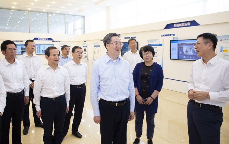 随后,丁薛祥前往北京教育考试院,考察试卷流转一体箱、智能考务终端、纸笔考试扫描评卷系统等设备,观看北京市国家教育考试综合管理平台演示,听取高考准备工作情况汇报。他强调,公平公正和安全是高考的生命线,要贯穿到高考工作的每一个环节。严格保密管理,加强试卷命题、印制、运送、保管全流程监管,坚决杜绝泄密问题发生。严肃考风考纪,严厉打击考试舞弊,坚决查处售卖作弊器材行为。严把评卷质量关,严格招录程序,确保考试公平、程序公开、结果公正。丁薛祥要求各级党委政府把高考当作治理能力大考,抓紧抓实抓好各项服务保障工作,向党和人民交上一份满意答卷。