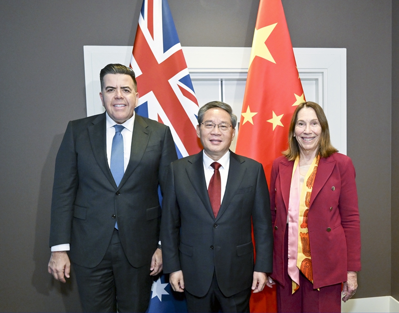 当地时间6月17日上午,国务院总理李强在堪培拉集体会见澳大利亚联邦议会参议长莱恩斯、众议长迪克。新华社记者 高洁 摄