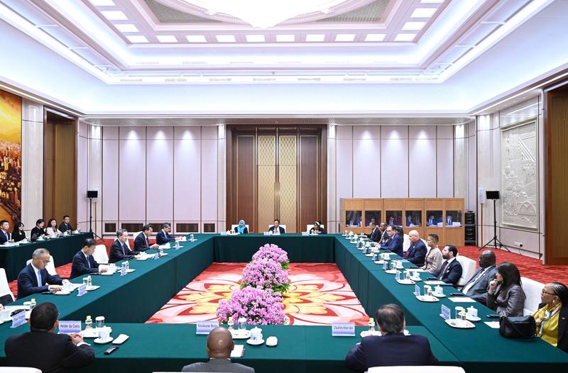 7月12日,中共中央政治局常委、国务院副总理丁薛祥在北京集体会见出席全球共享发展行动论坛第二届高级别会议的外方代表。新华社记者 申宏 摄