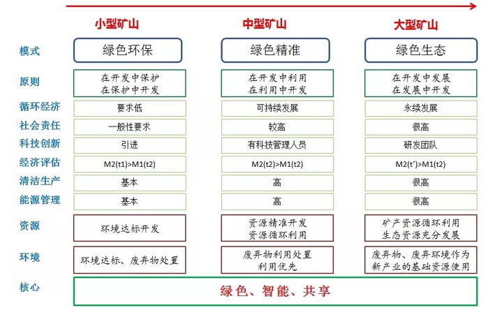“绿色、智慧、共享”是绿色矿山的最基本要求,绿色体现出科学有序的开采过程要对矿区及周边环境的扰动可控;智慧是采用现代技术和自动化装备提高生产率和经济效益,将矿山生产维持在最佳状态和最优水平;共享是通过将资源、人才、技术、资讯、收益等与股东、职工、社区分级共享做到社会和谐。绿色环保型矿山、绿色精准型矿山、绿色生态型矿山都是绿色矿山的不同模式,适合于不同矿井类型和区域环境。
