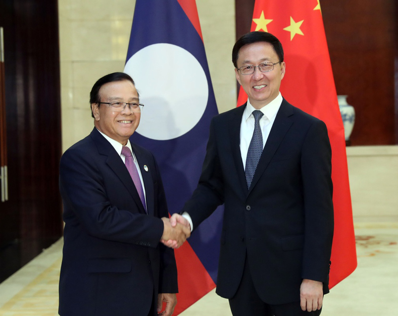 9月11日,中共中央政治局常委、国务院副总理韩正在广西南宁会见出席第十五届中国-东盟博览会和中国-东盟商务与投资峰会的老挝副总理宋迪。新华社记者 刘卫兵 摄