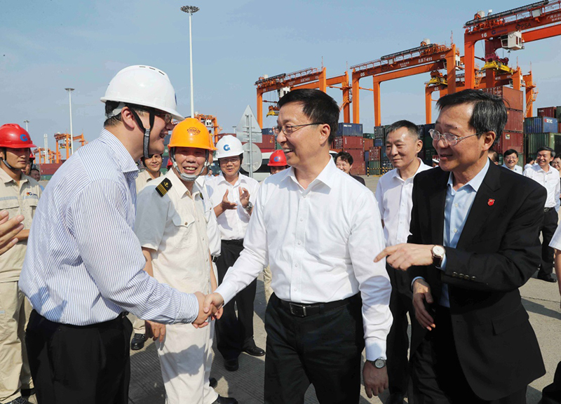 9月12日至13日,中共中央政治局常委、国务院副总理韩正在广西南宁、钦州、北海调研经济社会发展情况。这是9月12日,韩正前往钦州保税港区,考察南向通道建设。新华社记者 刘卫兵 摄